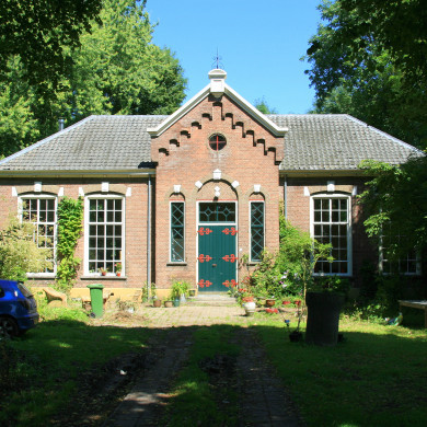OPENBARE DORPSSCHOOL met HEK gebouwd in 1884 naar ontwerp van de architect G.A. SCHOLTEN in opdracht van de heer Kuijpers, schoolopziener van het district Tiel.