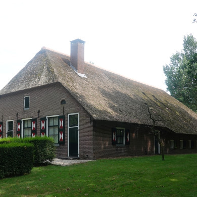 De BOERDERIJ is met de nokas haaks op de weg gesitueerd en bezit een rechthoekige plattegrond. Het afgewolfde schilddak is belegd met riet en de nok is voorzien van rietvorsten. De dakvoet bezit in de beide zijgevels een zeeg (die kenmerkend is voor Veluwse boerderijen) ter plaatse van de overgang van voorhuis naar achterhuis. Alleen in het rechter dakvlak in het voorhuis komt een schoorsteen voor die deels opnieuw is opgemetseld. De gevels zijn opgetrokken in baksteen en gemetseld in kruisverband. De meeste luiken van de vensters bestaan uit triplex en zullen tijdens de restauratie door plankendelen worden vervangen.