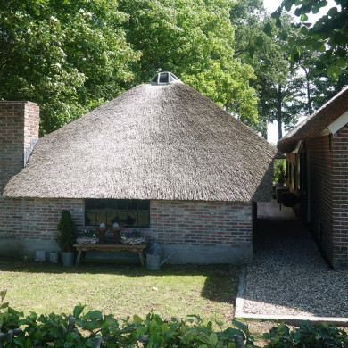 Boerderij, midden 19e eeuw, onder rieten wolfdak en met in de voorgevel vensters met luiken en 20- en 9- ruitsschuiframen.