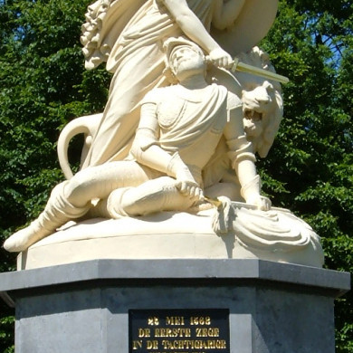 MONUMENT bestaande uit een beeldengroep van geverfde kalksteen (vier soorten) staande op een achthoekige geprofileerde sokkel van Belgische hardsteen. De beeldengroep stelt voor de stervende graaf Adolf van Nassau (symboliseert de Nederlandse onafhankelijkheidsstrijd) die dodelijk gewond ligt aan de voeten van de Nederlandse maagd, die hem beschermt met schild en zwaard. De graaf houdt met zijn rechterhand krampachtig het vaandel vast, waarop staat geschreven Recuperare Aut Mori (herwinnen of sterven). Achter de Nederlandse maagd staat de brullende Nederlandse leeuw, die naar het zuiden kijkt waar de vijand vandaan komt. Hij houdt zijn poot stevig op een oorkonde, waarmee hij uitdrukt: "Wat in de klauwen van de leeuw is, ontrukt hem geen mens". In de basis van de beeldengroep is gekerfd `J.H. Egenberger nv' `geefs. sculps.'.