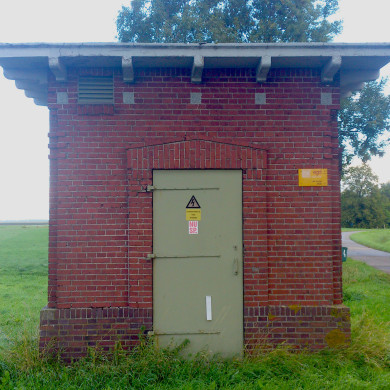 De trafo is markant gelegen in het open veld aan de doorgaande weg van Nieuwolda.