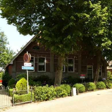 KAASBOERDERIJ van het in de streek zeldzaam voorkomende hallenhuistype, gebouwd in 1895 in Ambachtelijk-traditionele trant met Neo-Renaissance elementen in de voorgevel, met bijbehorende ERFSCHEIDING. Opmerkelijk zijn de ver doorgetrokken dakschilden, de hoge hooizolder waardoor een tweede woonlaag is ontstaan en de dubbele opkamer aan de voorzijde. Ook een bijzonderheid is dat de stal doorliep tot aan de voorgevel, waar vanwege het representatieve karakter een woonhuisraam is aangebracht. Rond de voortuin met drie monumentale lindebomen een eenvoudig ijzeren hek.