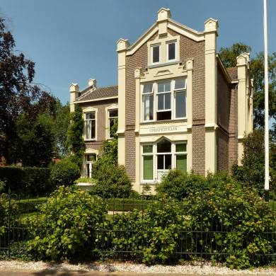 Op een L-vormige plattegrond opgetrokken pastorie van twee bouwlagen in grauw/rood bakstenen kruisverband onder met gesmoorde oude holle pannen gedekte zadeldaken. In het metselwerk boven de begane grond een kantstenen bakstenen fries en onder de dakrand een bloklijst. Rondom een donkergroen geschilderde gepleisterde plint. Aan de achterzijde, een eenlaagse keukenaanbouw onder een met gesmoorde tuile du Nordpannen gedekt geknikt dak. De drie kopse tuitgevels zijn op vergelijkbare wijze geleed met gepleisterde hoeklisenen met afzaten, banden en dekplaten en een gepleisterd fries langs de dakrand. Boven de hoeklisenen en in de tuit op een console bevinden zich eenvoudige aedicula-achtige blokken. Binnen de lisenen is in pleister de volgende geleding aangebracht: een plint met rechthoekige spaarvelden op de begane grond, een smallere drievlaksverdeling met boven het midden een keperboog die een fries met rechthoekige spaarvelden doorbreekt. Hierboven op de verdieping een borstwering met daarboven een rechtgesloten drievlaksverdeling onder een getrapt veld met daarin een trapeziumvormig spaarveld. Aan weerszijden van deze geleding vergelijkbare pilasters als op de hoeken met dezelfde aedicula-achtige blokken. Aansluitend op de zolderverdieping twee gekoppelde vensters onder een fronton dat overgaat in de bekroning van de geveltop. De tuitgevel aan de straatzijde (Z) heeft op de begane grond en op de verdieping in alle vlakken (schuif)ramen met bovenlichten en in de borstwering de naam 'Ghispesteijn' in cursief. De tuitgevel aan de oostelijke kant heeft alleen in de middelste vlakken glas (T-ramen), in de borstwering een sierlijst als de kantstenen bakstenen lijst en reliëfcirkels in het fries. De tuitgevel aan de westelijke zijde is hetzelfde maar op de verdieping geheel blind.