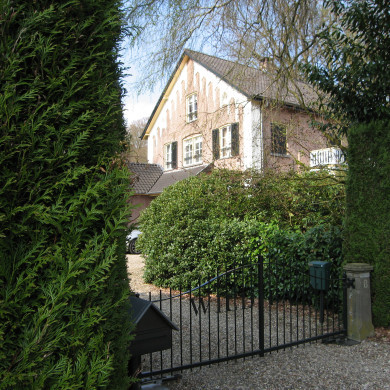 De LINKER GEVEL heeft een wit gepleisterd klimmend keperfries met hangende consoles. Hierin gaan twee keperboogvormige zolderraampjes schuil, het linker met gietijzeren gebogen roeden. Aan deze zijde heeft het huis drie vensterassen, waarvan de wat bredere middelste met de ingang, en de linker nu schuil gaan achter een moderne aanbouw onder een lessenaarsdak. Haaks hierop heeft deze aanbouw een uitbouw met een zadeldakje. Heeft door de aanbouw de begane grond nu maar één venster van het genoemde soort, de verdieping heeft er rechts en links één. In het midden bevinden zich twee gekoppelde vierruitsvensters onder een segmentboog met wat terugliggend boogveld. De zolder heeft één openslaand venster, met een smeedijzeren hekje als frans balkon, naast de reeds genoemde kleine zoldervenstertjes in het keperfries. Rond de verdiepingsvensters en het grote zoldervenster zijn diverse herstellingen aan het muurwerk slechts herkenbaar aan een verschil in voegspecie. Vermoedelijk zijn de middelste vensters gewijzigd. De ACHTERGEVEL is gericht op het weidse uitzicht over de weilanden. Evenals de frontgevel heeft deze een zeer brede middenrisaliet die ongeveer de helft van de breedte omvat, doch slechts één vensteras heeft. De smalle resterende ruimte rechts en links hebben ieder ook één vensteras. Zes ankers markeren de balklagen. In het midden is recent een stenen serre-achtige uitbouw geplaatst, aansluitend bij de stijl van het pand.