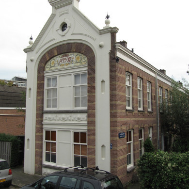 De achtergevel is blind met aansluitend op de langsgevels gele banden, een tuitgevel afgedekt met gepleisterde lijst en afdekstenen.