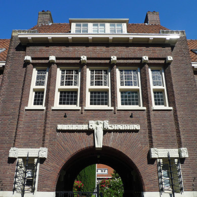 Carrévormig HOFJE, "Wilhelminastichting", met bijbehorende erfscheidingen, gebouwd in 1926-1927 naar ontwerp van de Dordtse architect B. van Bilderbeek (architectenbureau Van Bilderbeek en Reus), in een stijl die verwant is aan zowel de Haagse als de Delftse School. Het complex werd gebouwd in opdracht van de door het echtpaar Oldenborgh-Vriesendorp opgerichte Wilhelmina-Stichting en was aanvankelijk bestemd voor de (gratis) huisvesting van bejaarde dienstboden. De hofwoningen zijn geplaatst rondom een gemeenschappelijke binnentuin en hebben voor- en achtertuinen. In het poortgebouw is een regentenkamer ondergebracht. De aan de diverse gevels van het gebouw bevestigde beeldhouwwerken zijn van de hand van de Haarlemse beeldhouwer H.A. van den Eijnde, het glas-in-lood in de regentenkamer komt uit Atelier W. Bogtman te Haarlem. In de Tweede Wereldoorlog zijn enkele van de woningen verwoest, maar enige jaren later herbouwd conform de originele ontwerptekeningen.