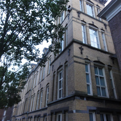 PALEIS VAN JUSTITIE, tussen 1912 en 1924 gebouwd in Eclectische stijl naar ontwerp van de Hoofdingenieur-Architect der Gevangenisssen en Gerechtsgebouwen W.C. Metzelaar. Door bezuinigingen tijdens en na de Eerste Wereldoorlog is het ontwerp ettelijke malen versoberd, onder meer door rijksbouwmeester S. Wijn. In 1944 steken de Duitsers bij het verlaten van de stad het aan de Spinhuiswal gelegen gedeelte in brand. De kap, gevel en achterliggende dienstvertrekken worden hierbij onherstelbaar beschadigd. De hoofdmassa van het gebouw alsmede de aan de achterzijde gelegen, rijk geornamenteerde zittingszalen blijven gespaard. Met name de zittingszalen behoren tot de fraaiste die het bureau Metzelaar in Nederland heeft ontworpen en ingericht. Het verwoeste gedeelte van het gebouw werd tussen 1948 en 1951 door rijksbouwmeester G. Friedhoff in samenwerking met rijksgebouwendienst-architect M. Bolten voorzien van een sobere maar stedenbouwkundig zeer markante façade in een vormgeving die invloeden van de Stuttgarter-Schule vertoont en een nieuwe inrichting met onder meer glas-in-lood van M. de Leeuw en enkele representatieve ruimtes. Het gedeelte aan de Sint-Jorisstraat met enkele markante zalen bleef vrijwel onbeschadigd.