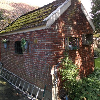 De BIJSCHUUR uit 1949 heeft beschoten gevels, noordzijde bruinrode baksteen op een aangesmeerd trasraam, en wordt gedekt door een zadeldak waarop oranje muldenpannen.