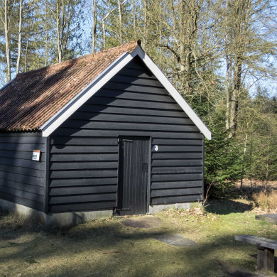 Aan de noordelijke zijde van het Leenderbos staat een DIENSTGEBOUW, de voormalige betaalkeet van Staatsbosbeheer, gebouwd omstreeks 1932-1933. Tijdens de crisisjaren werd in het kader van de werkverschaffing het Leenderbos aangelegd. De uit Helmond aangevoerde werklozen werden in de keet uitbetaald. Omstreeks 1990 is het golfplaten dak vernieuwd.