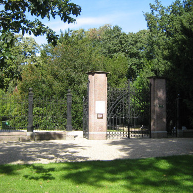 Erfscheiding, zowel aan de noordoost- als de zuidwestzijde bestaande uit ijzeren spijlenhekken verankerd in de zijgevels van de begraafplaatsaula en tussen ijzeren geprofileerde vierkante pijlers, bekroond door een bol, verankerd met krulvormige steun aan de achterzijde in dwarsgeplaatste muurtjes met natuurstenen afsluiting, waartussen muurtjes met ezelsrug. Aan de zuidwestzijde zijn vijftien ijzeren pijlers geplaatst, aan de noordoostzijde elf, waarvan twee naast de zijgevels. Tweevleugelige hoge ijzeren inrijhekken met spijlen, krullen en cirkels tussen hoge vierkante bakstenen pijlers met uitgespaarde hoeken en natuurstenen afzaten en dekplaten. Gesloten vormen de kwartboogvormige stijlen tussen de krullen een dubbele spitsboog. Enkele ijzeren toegangshekken ter weerszijden van de bakstenen pijlers met aflopende bovenzijde van hoogte inrijhekken naar hoogte spijlenhekken. Spijlen afgesloten door Franse lelies.