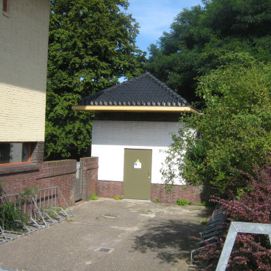 TRANSFORMATORGEBOUW, behorende tot het schoolcomplex 'De Wegwijzer', gebouwd in 1930 in Expressionistische bouwtrant naar het ontwerp van gemeente-architect W.M. Dudok, beeldbepalend gesitueerd aan de Insulindelaan, aan de zuidoostzijde van het schoolgebouw op de noordoosthoek aan de kruising van de Insulindelaan en de Sumatralaan.