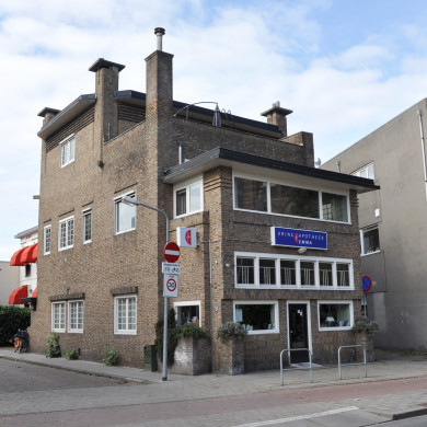 WINKELWONING 'EMMA-APOTHEEK', bestaande uit apotheek en woning, gebouwd in 1920-1921 naar het ontwerp van H.F. Sijmons en Th. Rueter in de stijl van de Nieuwe Haagse school, vrijstaand en teruggerooid gesitueerd aan de zuidwestzijde van de Emmastraat op een terrein op de hoek van de Emmastraat en de Nassaulaan.