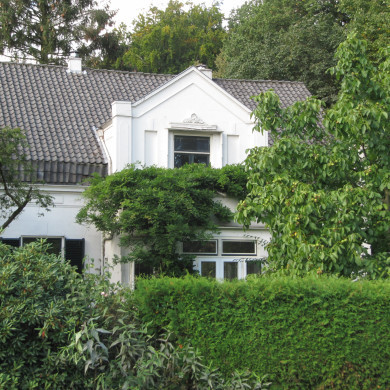VILLA in schilderachtige eclectische trant uit 1889, met bijbehorende ERFSCHEIDING, naar ontwerp van de bouwkundige J. de Groot, gesitueerd in villawijk 'De Boomberg'. De villa ligt iets teruggerooid naast het Rosarium.