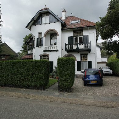 VILLA in eclectische trant uit omstreeks 1890 met bijbehorende ERFSCHEIDING in villapark 'De Boomberg', mogelijk ontworpen door de bouwkundige J. de Groot. De villa ligt iets teruggerooid in een tuin met gazon en bomen, aan de straatzijde afgesloten door een ijzeren tuinhek.