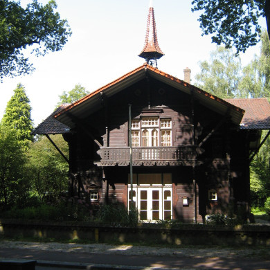 Voormalig KOETSHUIS met inpandige KOETSIERSWONING, gebouwd in 1898 in Chalet-stijl naar het ontwerp van A. Salm in opdracht van G. van Mesdag als onderdeel van het landgoed 'Quatre Bras' en gesitueerd aan de noordzijde van de 's-Gravelandseweg.