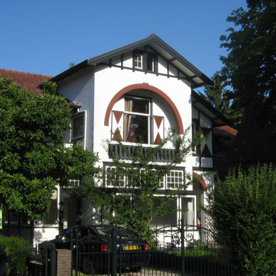 DUBBELE VILLA, gebouwd in 1901 in eclectische bouwtrant waarbij Jugendstil- en Chaletstijl elementen zijn gecombineerd, naar het ontwerp van J.H. Slot, beeldbepalend gesitueerd op een terrein op de hoek van de Koninginneweg en de Naarderstraat.