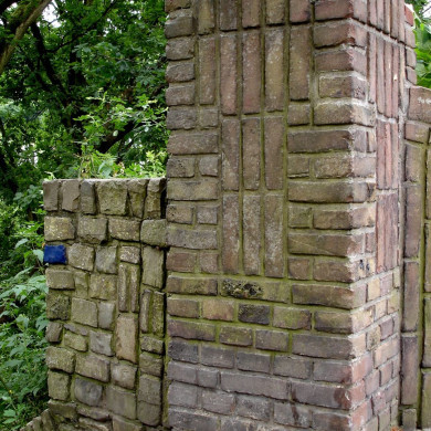 Bakstenen TRAPAFSLUITING bij de taludtrap naar de Oude Haven uit 1916 naar het ontwerp van W.M. Dudok. De trapafsluiting is gesitueerd op de hoek van de Badhuislaan en de Couperusweg. De trap in de zuidhoek geeft toegang tot de Oude Haven.