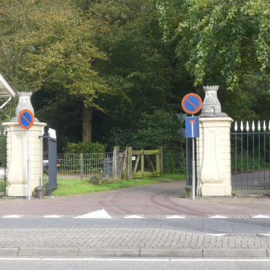 Ingangspartij gelegen aan de zijde van de Herenweg ter ontsluiting van de Sparrenlaan. In half ovaalvormig terugspringende hekpartij uit de eerste helft van de 18de eeuw bestaande uit forse met natuursteen beklede hekpijlers in blokmotief gedecoreerd en aan de voorzijde voorzien van een gedecoreerde pilaster. De bekroning met ronde van kantelen voorziene burchttorens is waarschijnlijk van latere datum. Tussen de hoekpijlers en aan de rechterzijde een eenvoudig smeedijzeren hek.