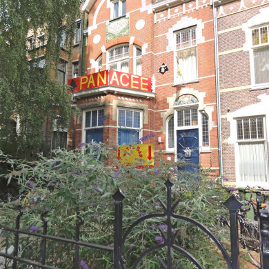 De voortuin wordt begrensd door een smeedijzeren hekwerk in Art Nouveau stijl.