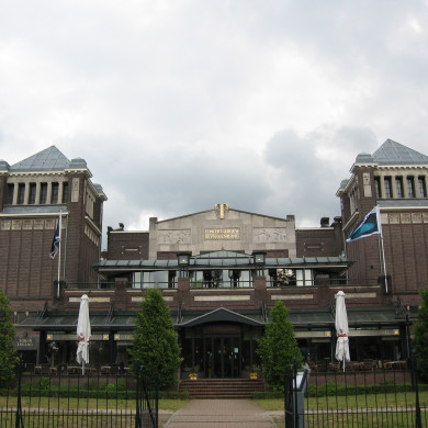 De VOORGEVEL wordt geflankeerd door twee hoge vierkante traptorens, gedekt met een zinken tentdak. Boven in de torens bevinden zich raampartijen achter een zuilenrij. De hoeken zijn voorzien van blokken natuursteen met gebeeldhouwde koppen. De voorgevel gaat op de begane grond schuil achter een latere uitbreiding van het restaurant. Op de verdieping springt de gevel een groot stuk terug en bevat hier een natuurstenen fronton op pilasters. Het fronton bevat links en rechts bas-reliëfs met personificaties van de instrumentale en vocale muziek, uitgebeeld door vrouwen, links gesigneerd `E. Everaerts uitg.', rechts `Henri Leeuw mcd'.