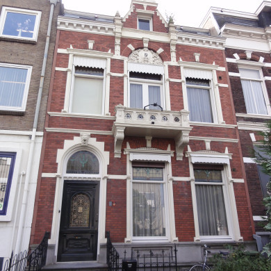 De VOORGEVEL telt drie assen en is in de eerste bouwlaag asymmetrisch en in de tweede bouwlaag symmetrisch ingedeeld. De VOORGEVEL is opgetrokken uit rode verblendsteen en versierd met hardstenen en gepleisterde elementen, zoals een plint, waterlijsten, speklagen, diamantkoppen en een fries. De gevel heeft een verhoogde hardstenen plint met twee getoogde keldervensters, gebosseerde blokken, twee waterlijsten en velden met diamantkoppen onder de vensters van de begane grond. Links geeft een hardstenen stoep met geornamenteerde smeedijzeren leuningen toegang tot de met renaissance-motieven versierde voordeur. De deur heeft een rondboogvormig afgesloten raam met gekleurd glas-in-lood en een rijk geornamenteerd smeedijzeren rooster en bevindt zich in een kozijn op hardstenen neuten, dat is voorzien van een bewerkt kalf en een rondboog-bovenlicht met gekleurd glas-in-lood. Het kozijn is gevat in een geprofileerde gepleisterde omlijsting met diamantkoppen, imitatie-natuursteenblokken en een leeuwenkop als sluitsteen. Rechts van de deur bevinden zich twee vensters met schuiframen en bovenlichten met gekleurd glas-in-lood in een geprofileerde gepleisterde omlijsting met diamantkoppen en een kroonlijst, waarboven segmentboogvormige boogtrommels met patroontegels zijn geplaatst. De bogen hebben gepleisterde geboorte- en sluitstenen. De vensters zijn voorzien van geornamenteerde lamberkijnen.
