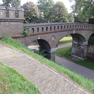 VOETBRUG in het Hunnerpark, vermoedelijk naar ontwerp van de Nijmeegse stadsarchitect JACOB JAN WEVE (1852-1942) in 1883 (datum in sluitsteen) gebouwd. Het Hunnerpark ligt ten noordoosten van het stadscentrum van Nijmegen en is een van de vier parken die naar ontwerp van de tuinarchitect Lieven Rosseels uit Leuven werden aangelegd op de voormalige verdedigingswerken. De brug verbindt een voetpad over het restant van de voormalige vijftiende-eeuwse walmuur met de Belvédère, die door Weve in dezelfde tijd ingrijpend gerestaureerd werd.