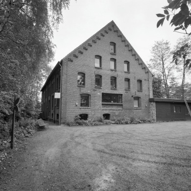 In het middendeel van de voorgevel in de eerste bouwlaag een grote gemetselde rondboog met hierin een authentiek houten kozijn waarvan echter de indeling is gewijzigd thans met een rechthoekige dubbele deur met rechthoekige zijlichten en een breed geleed bovenlicht. In de tweede bouwlaag vier rechthoekige houten vensters met niet authentieke houten kozijnen. In het linkerdeel van de voorgevel twee smallere traveeën waarvan een met in de eerste bouwlaag een groot rechthoekig venster met ijzeren kozijn met kleine roedeverdeling. In de tweede bouwlaag van deze travee een rechthoekig venster met een niet authentiek houten kozijn. De travee geheel links heeft in de eerste bouwlaag een haakse aanbouw met plat dak. De tweede bouwlaag van deze travee is blind. Het metselwerk in niet authentiek. In de voorgevel tussen de eerste en tweede bouwlaag gietijzeren muurankers.