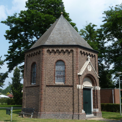 Vrijstaande kapel met centraal achthoekig grondplan. De kapel telt een bouwlaag en wordt afgedekt met een tentdak gedekt met leien. Dak bekroond met smeedijzeren kruisje. Het toegepaste bouwmateriaal is baksteen in kruisverband. De plint en de hoeklisenen risaleren. Hoeklisenen extra geaccentueerd door toepassing rode baksteen. Ingang met rechthoekige houten dubbele deur in een rondboogvormige bakstenen omlijsting. Aan weerszijden van de deur een bakstenen driekwartzuiltje op een natuurstenen basement en met een natuurstenen kapiteel. Gehele ingangspartij iets risalerend en bekroond met een tuitgeveltje.