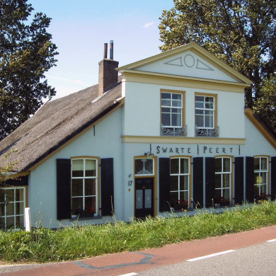 De wit gepleisterde HALLEHUISBOERDERIJ met ZOMERHUIS in schoon metselwerk bestaat uit één bouwlaag afgesloten door een met riet gedekt afgewolfd zadeldak. De oostzijde van het dak van het zomerhuis is deels gedekt met gesmoorde muldenpannen. De boerderij bevindt zich aan de westzijde van de Bandijk, met de nok loodrecht op de dijk gelegen. Het zomerhuis bevindt zich parallel aan de noordzijde van de boerderij. De voorgevel van het zomerhuis en de achtergevel van de boerderij liggen nagenoeg op één lijn. De VOORGEVEL (oostgevel) bestaat uit de voorgevel van de hallehuisboerderij en de voorgevel van het zomerhuis. In de voorgevel van de boerderij bevindt zich een middenrisaliet afgesloten door een fronton. Op de begane grond van de middenrisaliet bevindt zich een paneeldeur met een getoogd, enkelruits bovenlicht met aan de rechterzijde twee getoogde, zes-ruits schuiframen. Boven de muuropeningen op de begane grond bevindt zich de naam `SWARTE PEERT'. De begane grond wordt afgesloten door een waterlijst. Op de verdieping bevinden zich twee zes-ruits schuiframen met Franse balkons. Links en rechts van de risaliet bevindt zich een getoogd, zes-ruits schuifraam. De vensters op de begane grond worden aan weerszijden geflankeerd door geklampte luiken. In de voorgevel met gepleisterde plint van het zomerhuis bevindt zich van links naar rechts een geklampte, rechthoekige deur met twee-ruits bovenlicht, twee vensters bestaande uit een negen-ruits onderraam met drie-ruits klapraam. De muuropeningen worden aan de bovenzijde afgesloten door een strek. De afgewolfde topgevel wordt afgesloten door een decoratieve, houten dakrand.