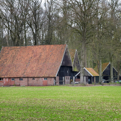 HOEVE "De Meesterkok", bestaande uit een in oorsprong vermoedelijk laat 16e-eeuwse vakwerkboerderij onder met rode Hollandse pannen gedekt zadeldak, een weefhuisje van vakwerk onder met rode Hollandse pannen gedekt zadeldak, een grote houten schuur onder met blauwe Hollandse pannen gedekt zadelda