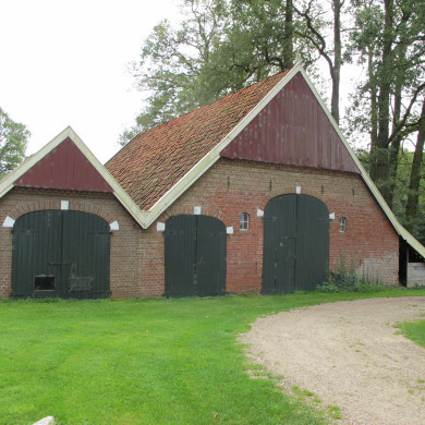 Omschrijving onderdeel B Een SCHUUR op rechthoekig grondvlak met een links aangebouwde, kleine nevenschuur. De schuur en nevenschuur zijn beide gedekt door inzwenkende zadeldaken, waarvan de schilden zijn belegd met rode oudhollandse pannen. De daken zijn voorzien van witgeschilderde windveren aan voor- en achtergevel. De gevels zijn opgetrokken in rode baksteen in kruisverband. De VOORGEVEL heeft een met planken beschoten geveltop en een grote dubbele inrijdeur onder korfboog met gepleisterde boogstenen. De grote deur wordt geflankeerd door zijvensters met ijzeren vorkroeden en links van de deur bevindt zich een vergelijkbare kleinere deur. De VOORGEVEL van de linker aanbouw heeft een vergelijkbare uitvoering met een inrijdeur onder segmentboog.