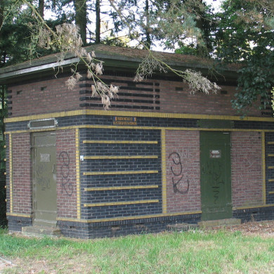 TRANSFORMATORHUISJE met tegeltableau gebouwd tussen 1920 en 1930 in opdracht van de P.G.E.M. naar ontwerp van het type G4L van G. VERSTEEG in zakelijk expressionistische bouwtrant.