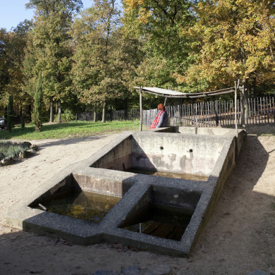 Twee identieke WIJNPERSEN van beton die in een helling zijn ingegraven. De persen zijn elk opgedeeld in twee grote en twee kleine bakken. In de bovenste grote bak kunnen druiven worden geperst door er met blote voeten in rond te lopen. Het sap loopt vervolgens door kleine openingen naar de lager gelegen bakken. Op de bovenste bak heeft waarschijnlijk een loofhut gestaan.