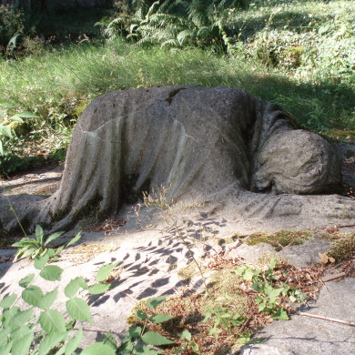 Ommuurde HOF VAN OLIJVEN (1915-1916) waarin GROT met OLIJFPERS, GRAFKAPEL en twee stenen BEELDEN.