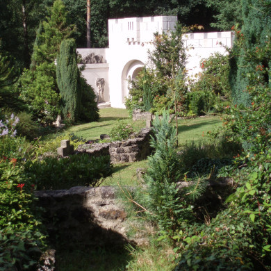 BEGRAAFPLAATS met GRAFMONUMENTEN en bijbehorende AANLEG, alsmede vier RELIEFSTENEN en drie stenen BEELDEN.