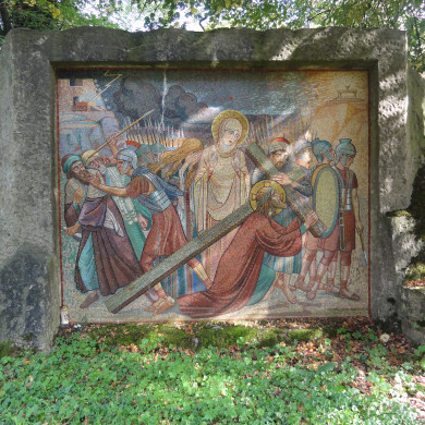 In 1915 werden op palmzondag 14 eenvoudige gedenkstenen geplaatst als tekens van Christus' kruisweg door de straten van Jeruzalem. Een aantal van deze kruiswegstaties is in de periode 1916-1931 verduidelijkt door bouwsels en/of figuratieve voorstellingen in reliëf of mozaïek. Dit object maakt binnen het complex van de Heilig-Land-Stichting onderdeel uit van het thema "lijdensweg van Christus".