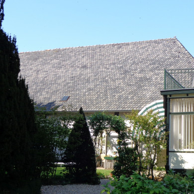 Links een groot zomerhuis met oude kozijnen en een door pannen gedekt wolfdak.