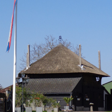 Links een groot zomerhuis met oude kozijnen en een door pannen gedekt wolfdak.