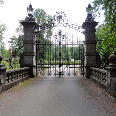 Aan de Staverdenseweg bevindt zich een TOEGANGSBRUG met een groot HEK over de omringende gracht. Vermoedelijk zijn ze tijdens de verbouwingen rond 1905 ontstaan. Tussen twee, van opliggende horizontale banden voorziene, pijlers bevindt zich een dubbel en sierlijk bewerkt ijzeren spijlenhek. Boven dit hek bevindt zich een eveneens ijzeren overbrugging tussen de twee pijlers, die is voorzien van siersmeedwerk en het wapen van Staverden. De pijlers zijn aan de bovenzijde afgesloten met een geprofileerde dekplaat met een sierlijk bewerkte ijzeren lantaarn daarop. Aan de waterkant van de pijlers zijn gebogen ijzeren zijhekken aangebracht. De brug zelf heeft aan weerszijden stenen balustraden met een pijler bolvormige beëindiging aan de uiteinden. Onder de hekpijlers zijn aan twee zijden ijzeren waterspuwers in de vorm van een kop aangebracht. De zijkanten van de brug zijn gepleisterd en geschilderd.