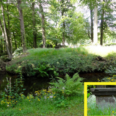 Op het ronde grafeiland bevindt zich een meerzijdige stenen SOKKEL met een geprofileerde dekplaat en inscriptie: 'Lenora 1353', ter herinnering aan Lenora - ook Eleonora of Alianora - de dochter van Eduard II, koning van Engeland en tweede echtgenote van Reinoud II, graaf en later hertog van Gelre. Zij werd beschuldigd van melaatsheid en werd daarom door haar echtgenoot, Graaf Reinoud II, verlaten. De geest van de 'Zwarte Vrouwe' zou nog steeds in het gebied rondwaren.