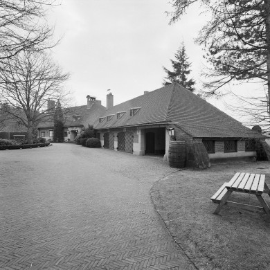 LANDHUIS (1) naar ontwerp van ir. F.A. Eschauzier, gelegen aan de zuidzijde van de oprijlaan. Op verzoek van de opdrachtgever zijn overwegend materialen toegepast die weinig of geen onderhoud vergen. Het landhuis is gebouwd op een nagenoeg P-vormige plattegrond, afgeleid van het uit Engeland afkomstige zogenaamde 'north-corridorplan'. Het landhuis heeft één bouwlaag en is samengesteld uit twee parallel geplaatste vleugels aan weerszijden van een open binnenhof, met op het noorden de keuken en de dienstbodekamers en op het zuiden, in het verlengde van elkaar de woon-, werk- en eetkamer. De hal verbindt beide aan de westzijde, de pantry aan de oostzijde. De eerste verdieping volgt de indeling beneden: de slaapkamers voor ouders, kinderen en loges op het zuiden, die voor de dienstbodes daar tegenover. De aan de westzijde haaks hierop gelegen lagere vleugel bevinden zich een jachtkamer, werkplaats, garage en wasplaats. De vier rond de binnenplaats gelegen vleugels van het hoofdgebouw zijn voorzien van zadeldaken. Alle daken zijn voorzien van rode leipannen en bezitten op zandstenen platen rustende dakoverstekken. Het schilddak van de vleugel waarin de garage gelegen is sluit op een vloeiende manier aan op het dak van de noordvleugel van het hoofdgebouw. Op de nokeinden van de daken van de noord- en zuidvleugel van het hoofgebouw bevinden zich hoge bakstenen schoorstenen. De grote dakvlakken worden op diverse plaatsen verlevendigd door dakkapellen met platte daken. Uitzonderingen vormen de boven de hoofdentree gelegen dakkapel met gebogen dak en een in het zuidelijk dakschild van de zuidvleugel gelegen dakkapel onder een schilddak met leipannen. Op de nok van de noordvleugel bevindt zich tevens een klein klokkentorentje met schaaldak. Het hoofdgebouw wordt aan de op de heide georiënteerde zuidzijde omgeven door een terras dat bekleed is met grote blokken gele Morley zandsteen. De kern van het huis bestaat uit een gewapend betonskelet. De buitengevels zijn opgetrokken op een plint van Etringer tufsteen uit rode handvorm baksteen gemetseld in Vlaams verband. De aan de binnenplaats grenzende gevels zijn uitgevoerd in gele handvorm baksteen verlevendigd door kalkstenen speklagen. Tevens bevindt zich hier in de torenachtige uitbouw van het trappenhuis een relief van Hildo Krop. De binnenplaats is belegd met keien. De goten van het gebouw zijn uitgevoerd in koper en voorzien van enige monogrammen. Ramen en deuren zijn overwegend uitgevoerd in brons. Alleen de garagedeuren zijn uitgevoerd in blank eikenhout. De ramen zijn veelal voorzien van glas in lood. Een uitzondering vormen twee forse puien in de achter(zuid)gevel die een zes of achtdeling bezitten en zo geconstrueerd zijn dat deze in de kelder kunnen schuiven waardoor het zowel vanuit de woonkamer als vanuit de eetkamer mogelijk is onbelemmerd het terras te betreden. De VOORGEVEL is asymmetrisch ingedeeld en bestaat uit de links gelegen gevel van het hoofdgebouw en de rechts hiervan gelegen vleugel met garage. De linker gevel bezit diverse vensters alsmede een opmerkelijke als zogenaamde bay-window uitgevoerde erker. Het rechts gelegen, van een tufstenen omlijsting voorziene, ingangsportiek heeft boven het portiek een reliëf van Han Richters bestaande uit een vrouwenfiguur met herten. De entree heeft aan weerszijden een lantaarn en is voorzien van een dubbele in brons en glas uitgevoerde deur. De vleugel waarin de garage is gelegen bezit enkele vensters alsmede twee dubbele in eikenhout uitgevoerde garagedeuren. De LINKER ZIJGEVEL bestaat hoofdzakelijk uit de zijgevels van de noord- en zuidvleugel waartussen zich de aanzet van een tuinmuur bevindt. De linker gevelhelft bezit een door middel van een aantal treden te bereiken portiek met deur een bay-window. Op de verdieping bevindt zich links een smeedijzeren balkon met verdiept gelegen balkondeuren en rechts een klein hoog geplaatst venster. De rechter gevelhelft bezit onder meer een verdiept gelegen deur naar de bijkeuken, een trap naar de kelder en enige vensters. Tegen de tuinmuur zijn een aantal van eikenhouten deuren voorziene kasten geplaatst. De ACHTERGEVEL van het hoofdgebouw heeft zowel links als rechts een pui die in de kelder kan schuiven. In het midden bevindt zich een loggia met vensters en een deur. De RECHTER ZIJGEVEL van het hoofdgebouw heeft links een breed venster waarop een loggia aansluit met twee deuren en een venster. Rechts hiervan bevindt zich een breed venster met een enkelruits raam. De verdieping is voorzien van twee vensters. De gevel van de vleugel met garage bezit diverse venster alsmede een doorgang met stootpalen. Het INTERIEUR van het landhuis is vrijwel gaaf bewaard gebleven en bijzonder rijk en in kostbare materialen naar ontwerp van Eschauzier uitgevoerd. Het interieur van het landhuis kan als een der best bewaarde en belangrijkste woonhuisinterieurs van Eschauzier worden beschouwd. Zo bezit de vestibule een vloer met marmerintarsia uitgevoerd naar ontwerp van Nel Klaassen,is de gang naar de woonkamer voorzien van een zandstenen gewelf en zijn de vloeren van diverse kamers voorzien van parketvloeren. De woonkamer bezit een forse schouw waarvan de boezem voorzien is van een relief van de hand van Han Richters voorstellende St.Joris en de draak. Tussen woon- en eetkamer bevinden zich met wit leer beklede schuifdeuren. De verbindingsruimtes zijn voorzien van glas-in-lood naar ontwerp van Erna van Osselen. Verder is het huis onder meer voorzien van balustrades in smeedwerk en een keukeninrichting uit de bouwtijd.