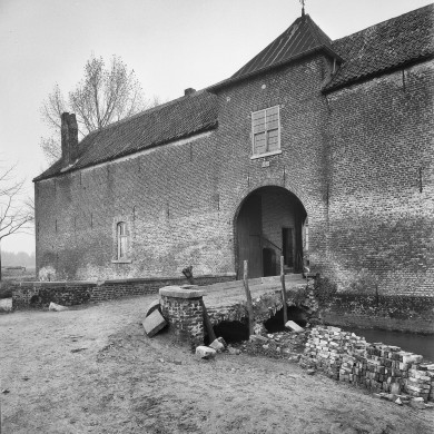 TOEGANGSBRUG tot de binnenplaats vanaf het voorplein, volgens sluitsteen in een van beide bogen in 1848 gerealiseerd (ter vervanging van een ophaalbrug); bouwkundig verbonden met de westvleugel van de kasteelboerderij; baksteen met twee bogen; lage borstwering met hardstenen dekplaten.