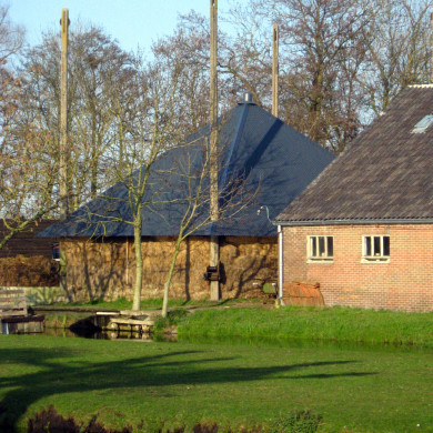 De hooiberg aan het uiteinde van het bedrijfsgedeelte van de boerderij heeft vier roeden en wordt thans afgesloten door een met golfplaten gedekt tentdak.