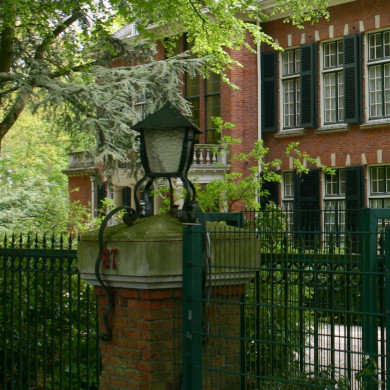 Boven van waalklinkers opgetrokken trasraam met afgesloten wordt door een rollaag zijn op een vierkant grondvlak, twee paar hekpijlers opgetrokken uit rode Waalsteen. Ze worden afgedekt door geprofileerde natuurstenen dekplaten, waarop smeedijzeren lantaarns zijn geplaatst, waarvan de staanders met decoratief gekruld smeedwerk over de zijkanten van de pijlers doorlopen.