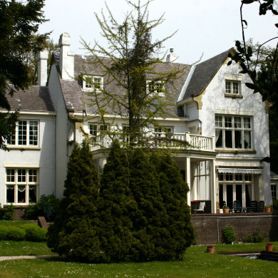 Aan de achterzijde grenst het huis aan een gemetseld terras; in het lagere gelegen gazon een rechthoekige gemetselde vijver.