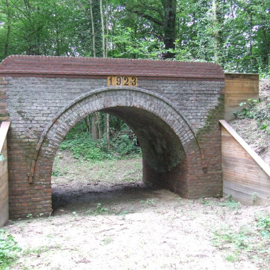 Middelste SMALSPOORVIADUCT annex TUNNEL, gekruist door een vrij bochtig, onderdoorlopend ACCESPAD. Over het viaduct liep oorspronkelijk het eigen smalspoor van kleiwarenfabrikant Alfred Russel. Over het vrij rechte accespad voerden aanvankelijk diverse andere plaatselijke pannenbakkers hun klei af per kar. Het viaduct dateert uit 1923. Het werd gebouwd in opdracht van Alfred Russel, waarschijnlijk ter vervanging van een ouder viaductje, en opgetrokken in Ambachtelijk-traditionele bouwtrant. Aan de westzijde bevindt zich een secundaire bovenrand in hardsteen.