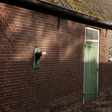 De linkerzijgevel bevat een viertal gietijzeren rondboogvormige stalvensters, afgewisseld met een drietal houten luiken en een deur.