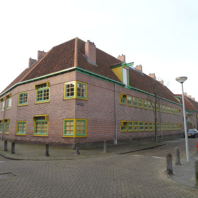 BEJAARDENHUIS "Karenhuis" uit 1918-1919 in sobere baksteenarchitectuur met bijbehorende TUINMUREN als erfscheiding aan de Leeghwaterstraat. Opdrachtgever was de Vereniging voor Volkshuisvesting Alkmaar die in 1917 een prijsvraag had uitgeschreven voor een gebouw waar ouderen zelfstandig konden blijven wonen. Dit voor die tijd zeer moderne idee was afkomstig uit Denemarken, waar Karen Petersen, een kennis van één van de oprichters van de vereniging, reeds een dergelijk woongebouw had gerealiseerd. De prijsvraag voor het gebouw werd gewonnen door de architecten J. Duiker (Den Haag 1890 - Amsterdam 1935) en B. Bijvoet (Amsterdam 1889 - na 1970), die hiermee hun eerste opdracht in de wacht sleepten en zich als zelfstandig architecten vestigden in Den Haag. Het in 1920 in gebruik genomen gebouw telde 34 één- en tweekamerwoningen bestemd voor bejaarden uit de lagere sociale klassen. Ieder kreeg een eigen woonruimte gelegen aan één van de brede gangen. Tegen de binnenmuur hiervan waren schouwen aangebracht waar de bewoners zelf konden koken. Per drie bewoners had men de beschikking over één toilet en verder waren er enkele gemeenschappelijke badkamers en tuinen. Modern voor die tijd waren de spouwmuren en betonvloeren die door de N.V. Enkhuizer Betonijzerbouw voorheen A. Last & Zonen werden vervaardigd. Het gebouw is gesitueerd tussen de Krelagestraat, de evenwijdig daaraan lopende Leeghwaterstraat en de Zocherstraat.