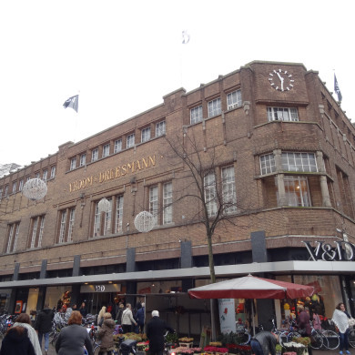 WARENHUIS in Late Amsterdamse Schoolstijl uit 1925 met Art Deco-detaillering, gebouwd in opdracht van Vroom & Dreesmann naar ontwerp van G.W.J. Caron uit Amsterdam. Oorspronkelijk was de gevel langs de Laat symmetrisch van opzet maar het gebouw is aan deze zijde in 1933 en 1969 uitgebreid. Het warenhuis is gesitueerd op de hoek van de Laat en de Ridderstraat.