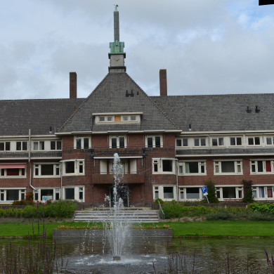 De terugliggende geveldelen tussen de midden- en hoekpartijen zijn op beide bouwlagen voorzien van vijf brede driedelige vensters bestaande uit een groot liggend middenraam geflankeerd door smalle zijramen met als bovenlicht een uitzetraam. In het dakvlak boven beide bouwdelen bevindt zich een doorgaande dakkapel die zich uitstrekt vanaf de tweede verdieping van de middenpartij tot boven de hoekpartijen. De dakkapellen zijn voorzien van stolpramen. In de hoek tussen de terugliggende bouwdelen en de hoekpartijen is boven de begane grond een L-vormig balkon aangebracht met afgeronde hoeken en een gemetselde borstwering. Beide balkons zijn zowel vanuit de terugliggende delen als de hoekpartijen toegankelijk via een dubbele balkondeur waartussen in de hoek twee gekoppelde tweeruits venster met middendorpel en glas-in-loodramen. Onder de balkons is in alle vier de bouwvolumes een stolpraam aangebracht. Hiernaast bevindt zich in de zijgevels van de hoekpartijen een tweede stolpraam waarboven op de eerste verdieping eveneens een stolpraam. Vóór de voorgevel is tussen beide hoekpartijen een verhoogd terras (waarop grijze trottoirtegels) aangelegd met tussen de opgangen links, rechts en in het midden twee gemetselde borstweringen die aan de uiteinden overgaan in een bloembak. De voorgevels van de hoekpartijen hebben op beide bouwlagen een brede vensterpartij samengesteld uit twee grote liggende ramen waartussen een met hout beklede afgeronde muurdam, en ter weerszijden een zijraam met als bovenlicht een uitzetraam. Tussen beide vensterpartijen is in dezelfde letters als bij de middenpartij links de tekst "HUIZE" aangebracht en op de rechter hoekpartij het bouwjaar "1932". Langs de voorgevels van de hoekpartijen loopt een gemetselde bloembak. Het voorschild van beide hoekpartijen draagt een dakkapel waarin twee stolpramen. Op de nok van de rechter hoekpartij staat achteraan een forse langwerpige schoorsteen van rode machinale baksteen in kettingverband. In de buitenste zijgevel van beide hoekpartijen zijn beneden twee stolpramen aangebracht en op de eerste verdieping een stolpraam en een dubbele balkondeur, waarvoor een klein halfrond balkon met gemetselde borstwering. Op het dakschild erboven staat een brede dakkapel voorzien van drie stolpramen. Voorbij de hoekpartijen zet de hoofdvleugel zich als het ware nog enkele meters voort. De hierdoor ontstane risalieten hebben in het voorschild een brede dakkapel en op de zijschilden een kleine dakkapel. De risaliet van de linkerzijgevel (NW) telt ter hoogte van het souterrain vier stolpramen en heeft op de begane grond en de eerste verdieping een samengestelde vensterpartij die zich tot in de zijgevels voortzet. In de risaliet van de rechterzijgevel (ZO) zijn op de verdieping twee driedelige vensters als voor aangebracht waartussen een smaller venster met bovenlicht; de vensters op de begane grond zijn gewijzigd. De rechterhelft van de rechterzijgevel heeft driedelige verdiepingsvensters en daaronder gewijzigde vensters. Boven dit geveldeel bevindt zich een doorgaande dakkapel waarin stolpramen. Het terugliggende middendeel van de linkerzijgevel (NW) telt boven het souterrain drie bouwlagen waarboven een plat dak. Hierboven zijn in het terugliggende dakschild drie brede dakkapellen aangebracht (elk met vier liggende ramen). Tussen de eerste en de tweede verdieping loopt een brede bakgoot. Onder deze goot wordt de gevel in het midden geleed door vijf aaneengeschakelde driezijdige erkers, met zowel op de begane grond als de eerste verdieping in het brede middendeel een groot liggend venster geflankeerd door een draairaam met bovenlicht (uitzetraam) in de schuine zijden. Ter weerszijden van de serie erkers is op de begane grond en de eerste verdieping een klein driezijdig balkon aangebracht met gemetselde borstwering (de balkondeuren zijn naderhand dichtgezet), waarnaast twee driedelige vensters als voor. In het souterrain en de tweede verdieping zijn voornamelijk stolpramen toegepast. Rond de dwarsbouw aan het einde van de T-vormige linker vleugel is boven de begane grond een betonnen balkon aangebracht. De dwarsbouw is voorzien van verschillende typen vensters en deuren, en van een schilddak waarin per dakvlak twee brede dakkapelen boven elkaar. Tegen de zuidoostzijde van de dwarsbouw bevindt zich een forse uitbouw van twee bouwlagen onder een plat dak. Dit bouwvolume heeft merendeels driedelige vensters als voor en in de zuidwest- en zuidoostgevel een driezijdige erker tot boven aan toe. De achtergevel van de linker vleugel en van de linker helft van de hoofdvleugel zijn boven het souterrain tot drie bouwlagen opgetrokken. Tussen de begane grond en de eerste verdieping is over de volle lengte een betonnen balkon aangebracht, tussen de eerste en de tweede verdieping een brede houten bakgoot. De derde verdieping (ter hoogte van de vliering in de kap) wijkt terug waardoor het platte dak van de tweede verdieping bij brand als vluchtweg kan fungeren. Evenals het souterrain is de derde verdieping voorzien van stolpramen. Op de begane grond zijn merendeels driedelige vensters aangebracht als voor. De eerste verdieping is voornamelijk voorzien van dubbele balkondeuren al dan niet geflankeerd door zijramen (deels met uitzetramen als bovenlicht). Tot aan de tweede verdieping wordt de achtergevel van de linker vleugel in het midden geleed door een serie van zeven driezijdige erkers. Hierboven zijn op de tweede verdieping driedelige vensters aangebracht als in de voorgevel maar minder hoog. Verder is de tweede verdieping voorzien van stolpramen. De achtergevel van de middenpartij heeft ter hoogte van het achterliggende trappenhuis een middenrisaliet waarin op de begane grond en de eerste verdieping drie nagenoeg vierkante (non-figuratieve) glas-in-loodramen. In de smalle geveldelen ter weerszijden van de door een schilddak met dakkapel bekroonde middenrisaliet zijn voornamelijk hoog geplaatste liggende vensters aangebracht, waarnaast ter hoogte van de eerste ver